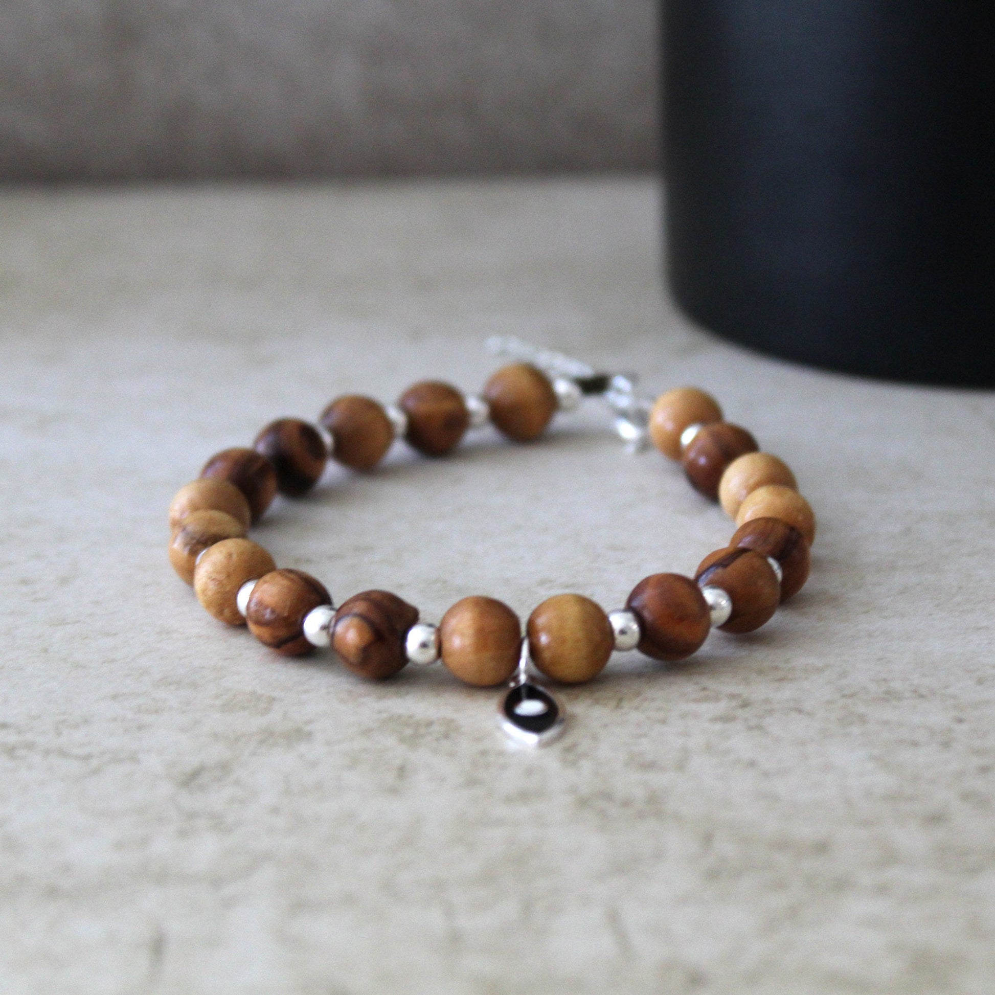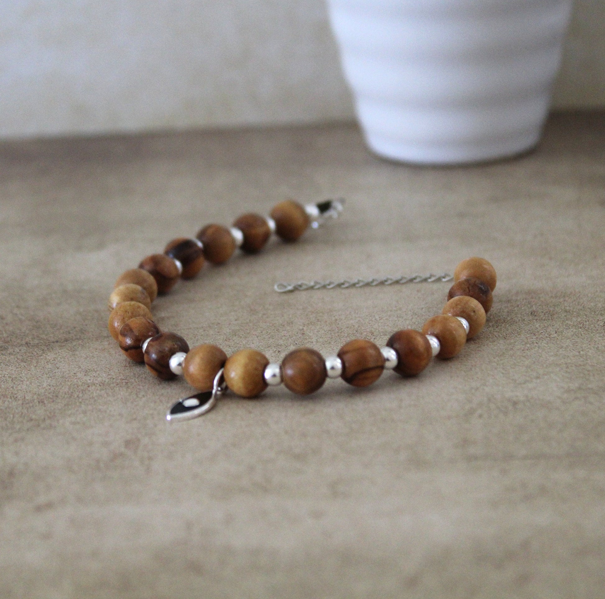 This mesmerizing bracelet is handcrafted from olive wood beads and exquisite 925 silver beads. It showcases a captivating array of colors and features an elegant black fish charm symbolizing strength, fertility, rebirth, and luck. Own this classic uplifting gift of faith to connect to the Land where biblical Prophets lived and bring cheer and joy to family and friends.