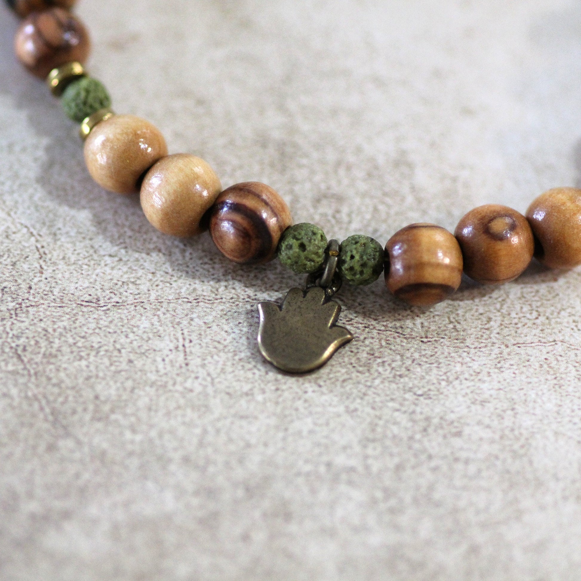 Embrace the natural serenity of olive wood and volcanic lava stone beads, adorning your wrists with light green hues, accompanied by a delicate Hamsa charm, uniting style and spirituality in perfect harmony.