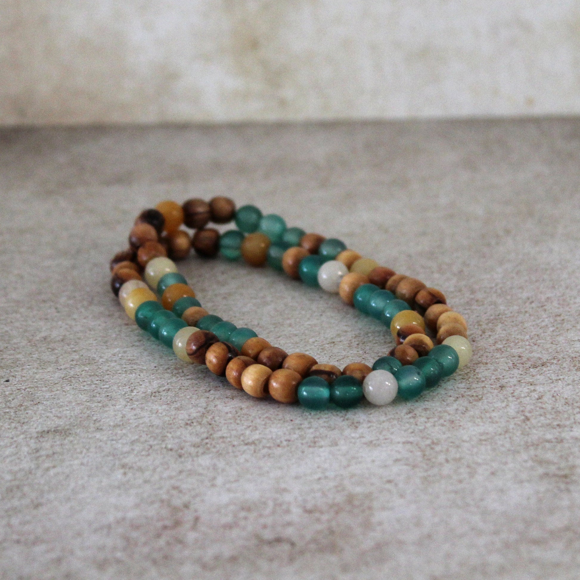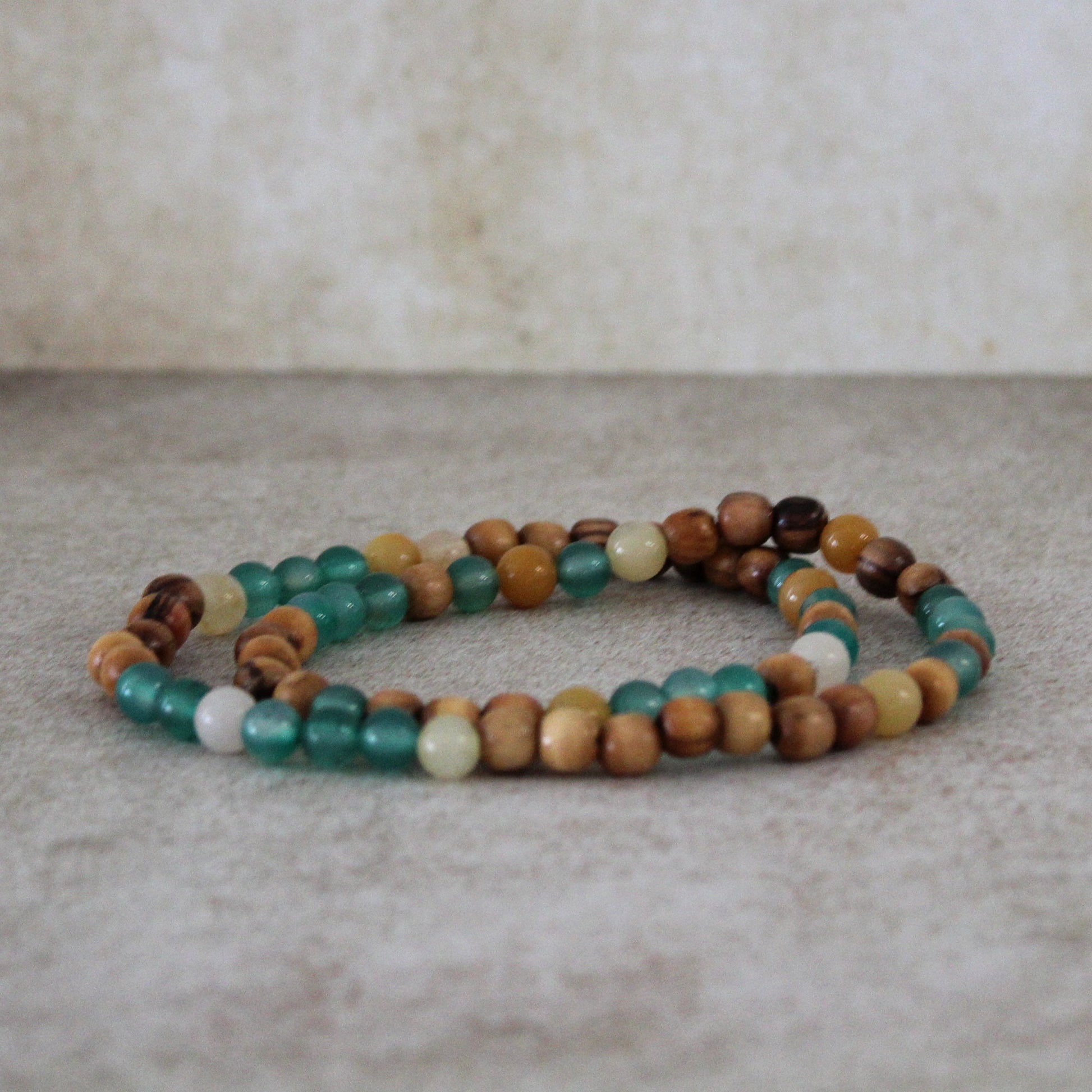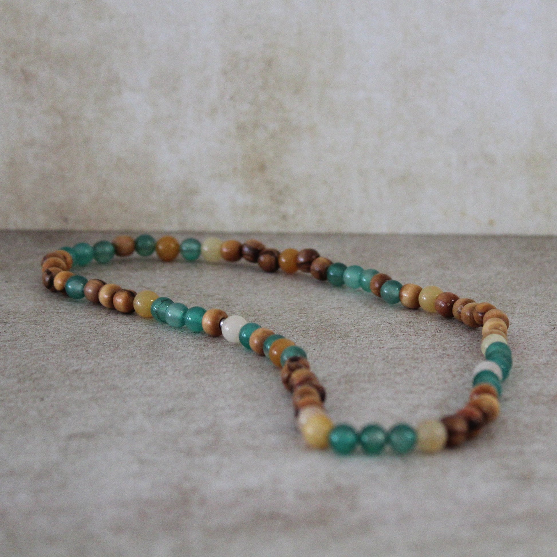 Enhance your jewelry collection with stunning accessories featuring small beads made of olive wood, and a stunning combination of yellowish, white and green Jade, and green Jade, adding a touch of elegance and earthy charm to your style. It is long enough for you to wrap it around your wrist twice.