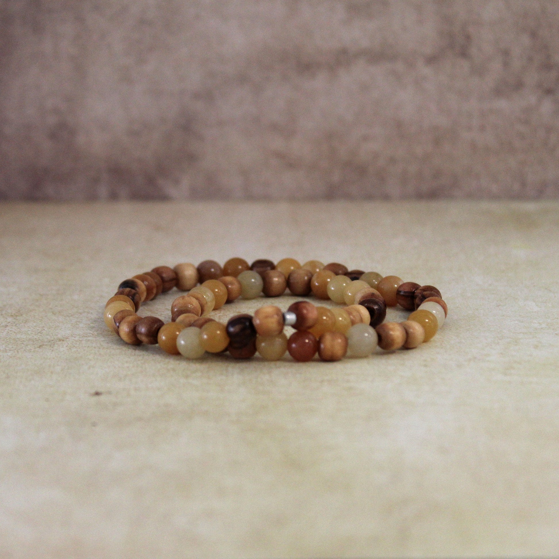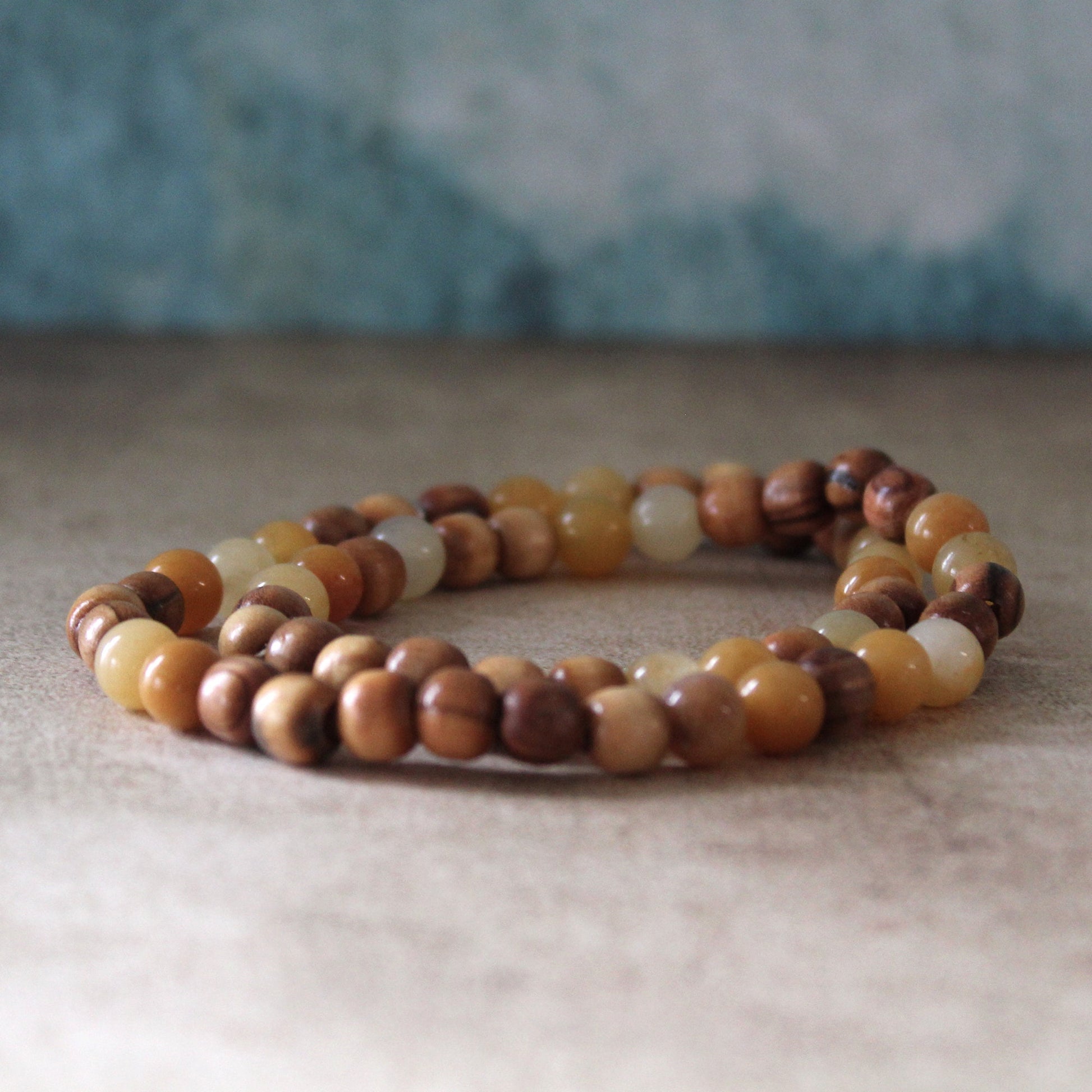 Enhance your jewelry collection with stunning accessories featuring small beads made of olive wood, and yellow Jade adding a touch of elegance and earthy charm to your style. It is long enough for you to wrap it around your wrist twice.
