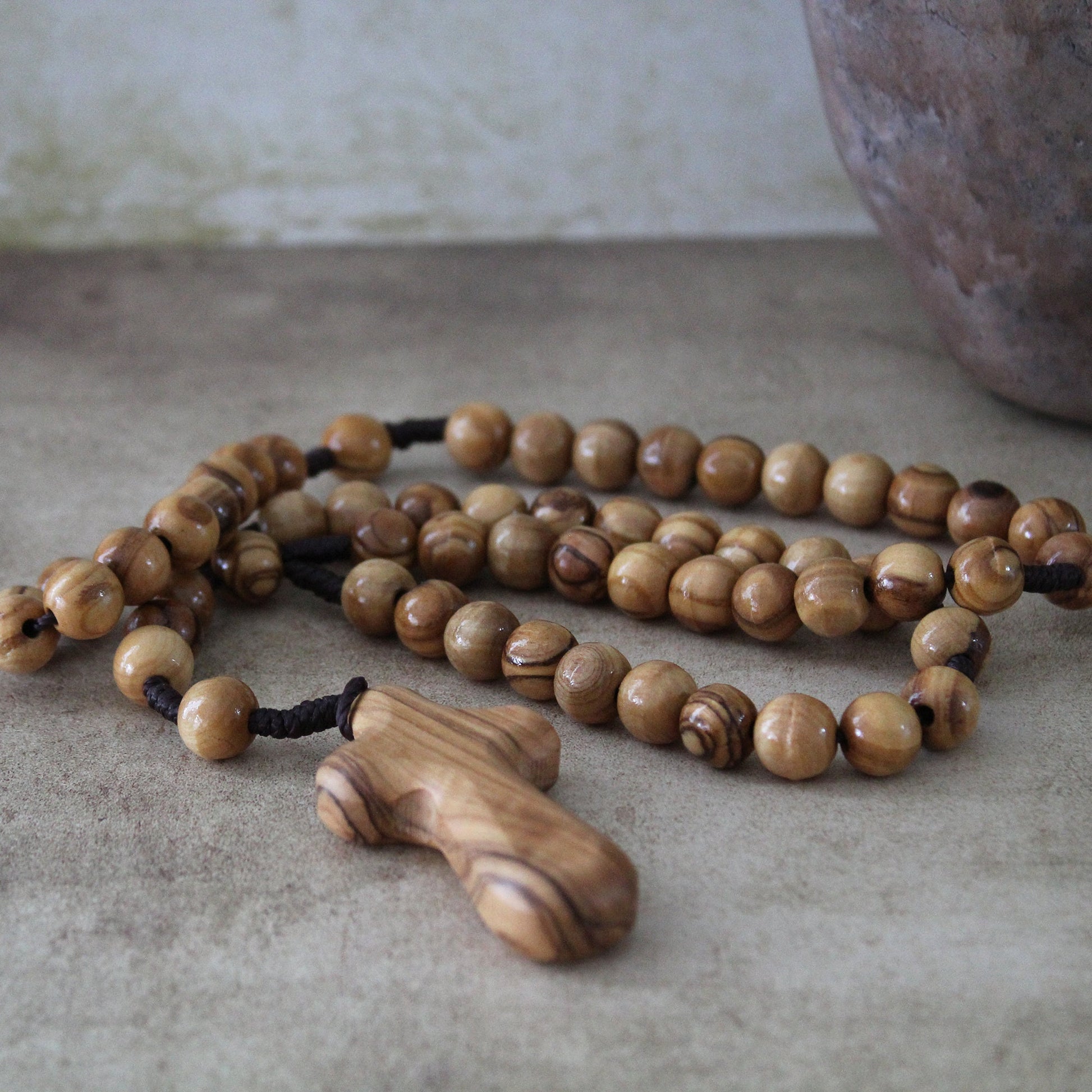 This wooden rosary necklace is perfect for your Christian friend or family member. Made from grade A olive wood that grew on the soils of the Holy Land, this wooden rosary will warm the heart of whoever receives it.
