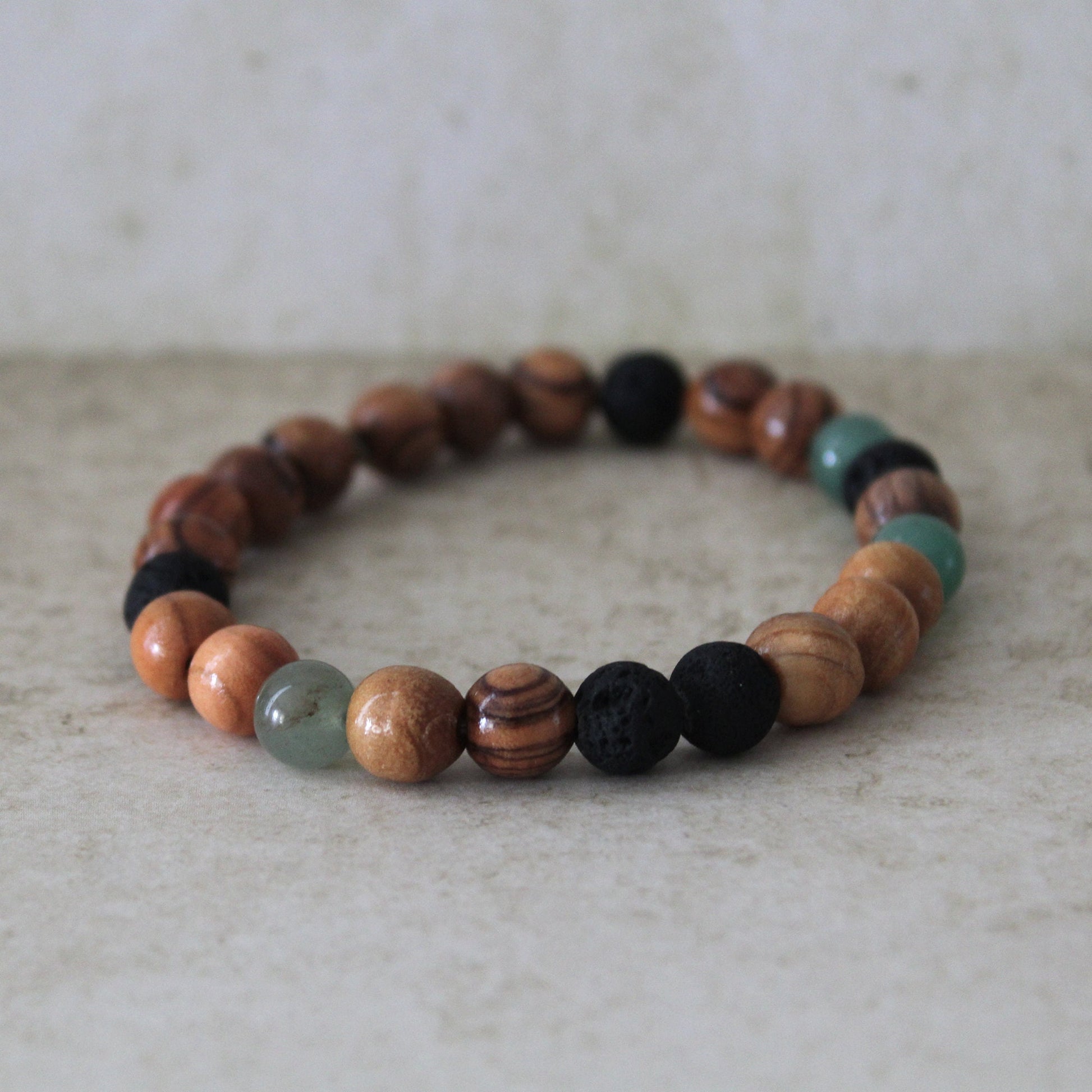 Greenish Jade and Olive Wood Earthy Stretch Bracelet with Black Lava Beads - Handcrafted Judaica Jewelry from Israel