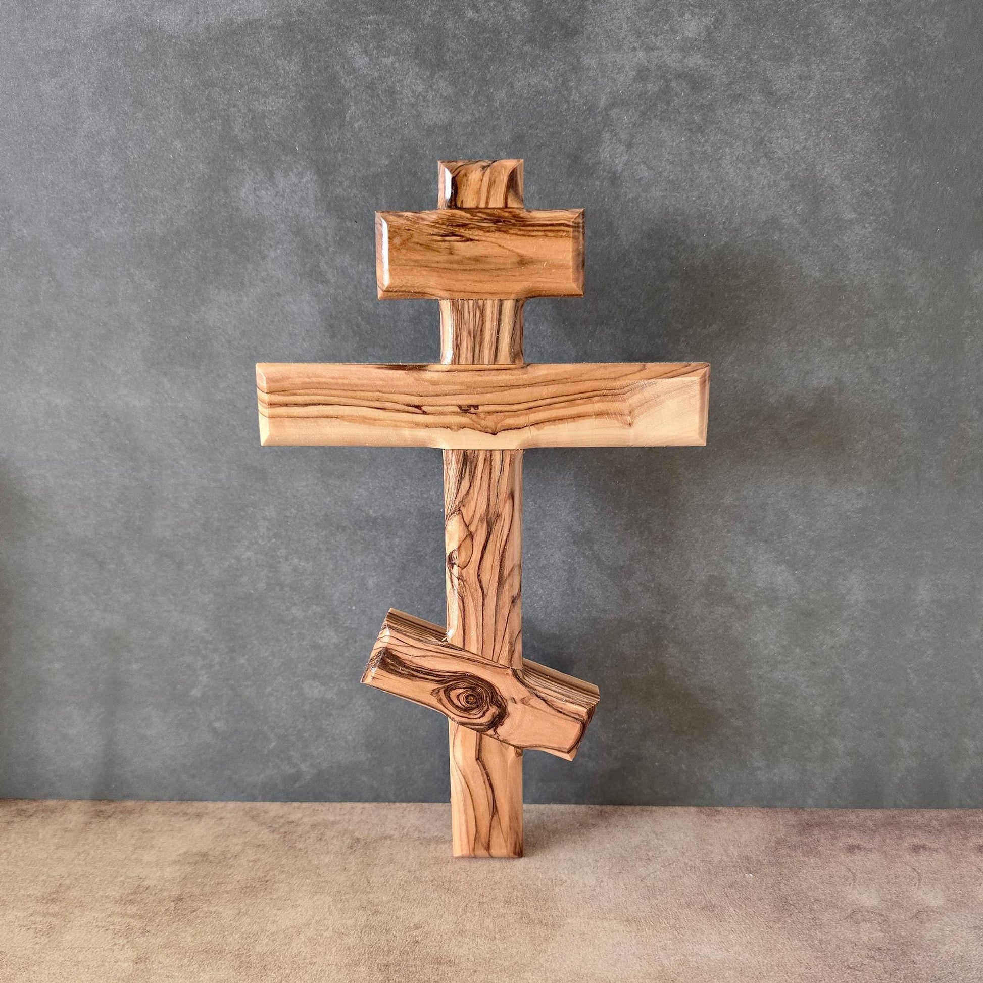 This wooden Russian Orthodox or three-bar Eastern Cross / Crucifix - Also known as the Patriarchal Cross, is hand-carved from olive wood found in the Holy Land. The overall appeal is neat and simple, making it a perfect piece to place on your altar or hang on a wall. The texture of the olive wood used to craft the piece makes each crucifix unique.