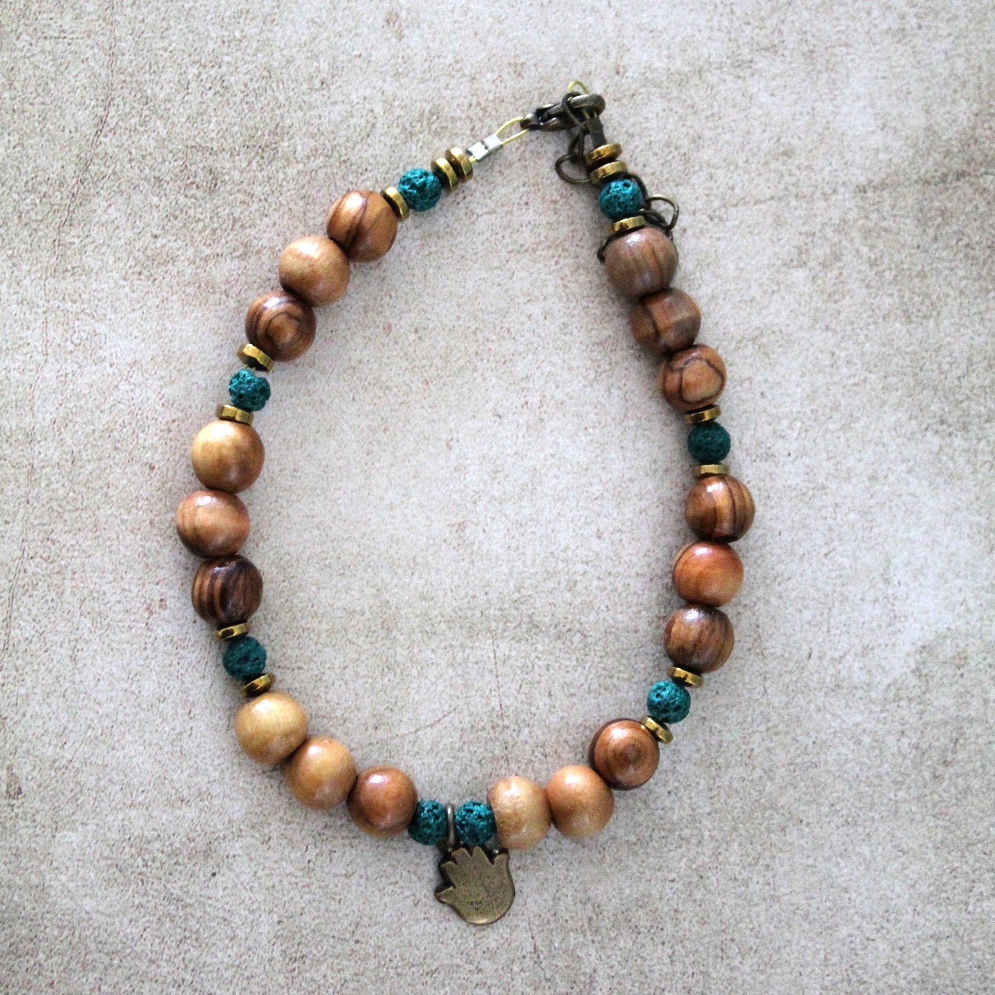 Adorn yourself with the captivating blend of olive wood beads and volcanic lava stone beads, accentuated by the vibrant turquoise green hues, all complemented by the symbolic presence of a Hamsa, exuding protection and positivity.