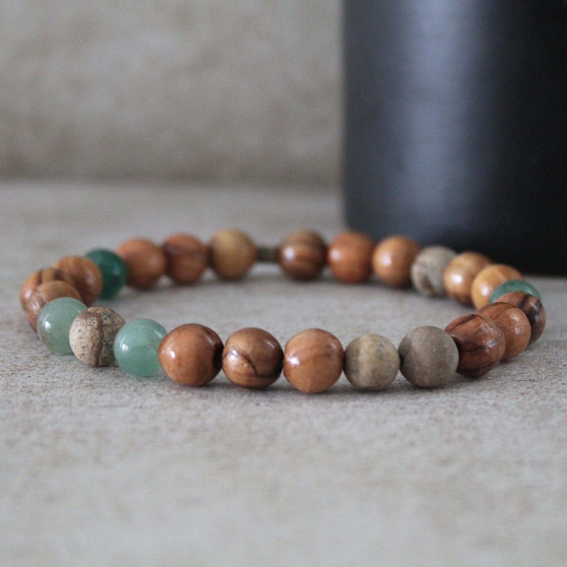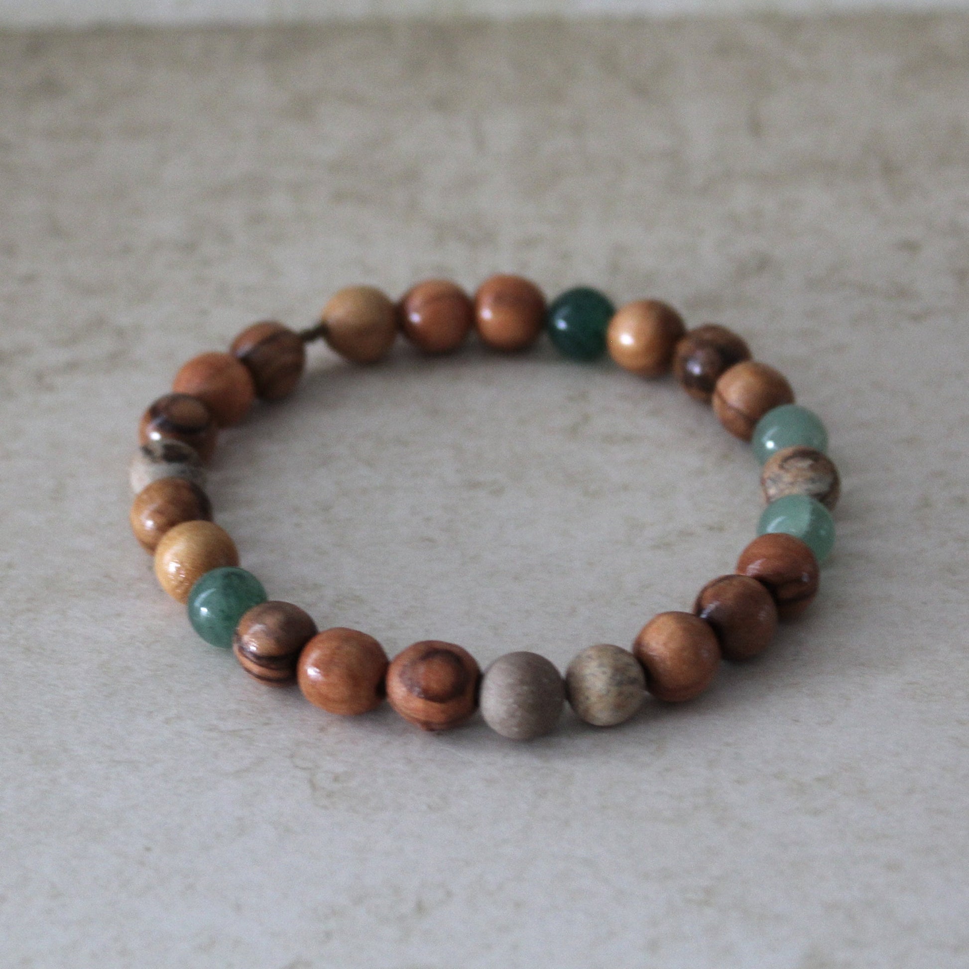 Olive Wood and Jasper Earthy Stretch Bracelet with Greenish Jade Beads - Handcrafted Judaica Jewelry from Israel