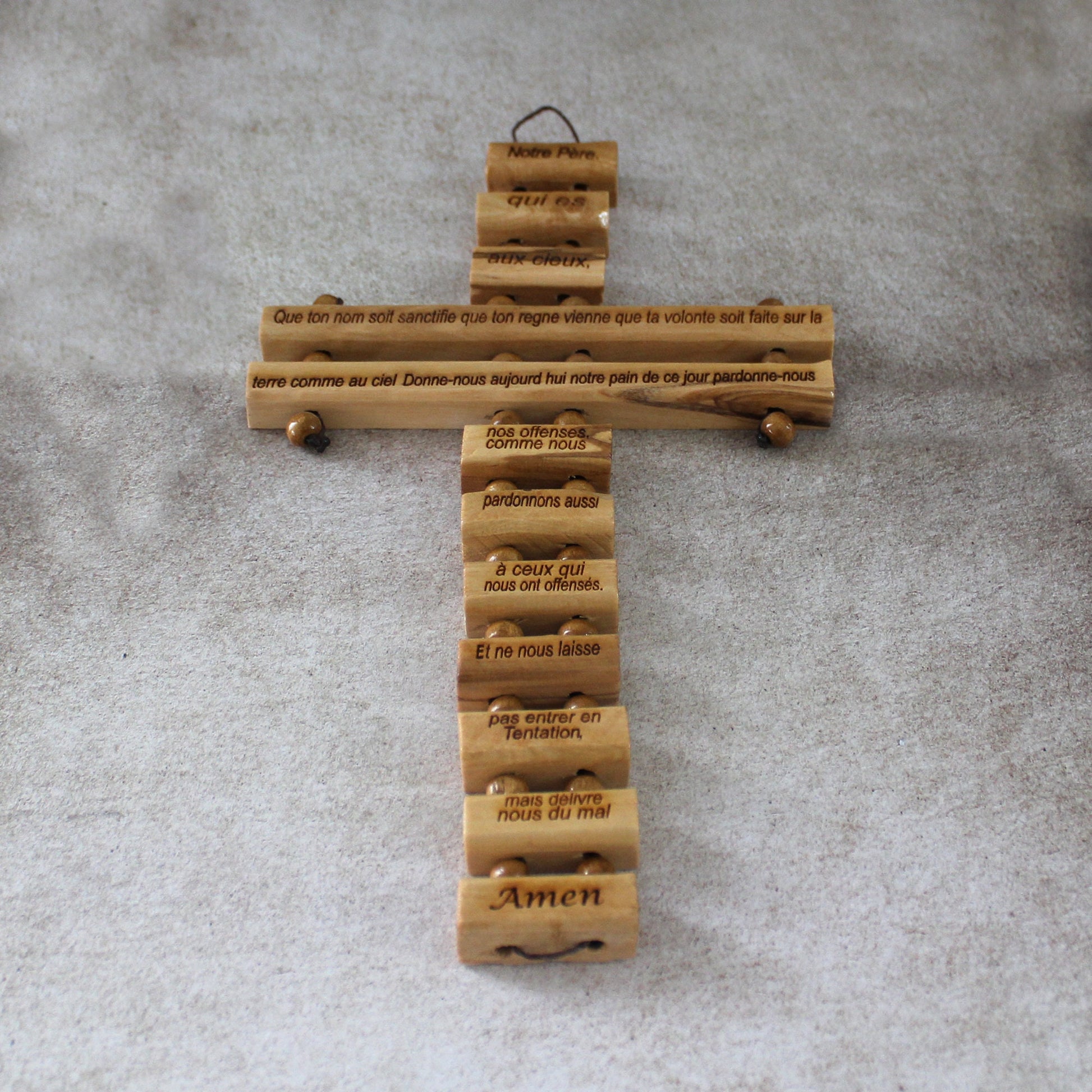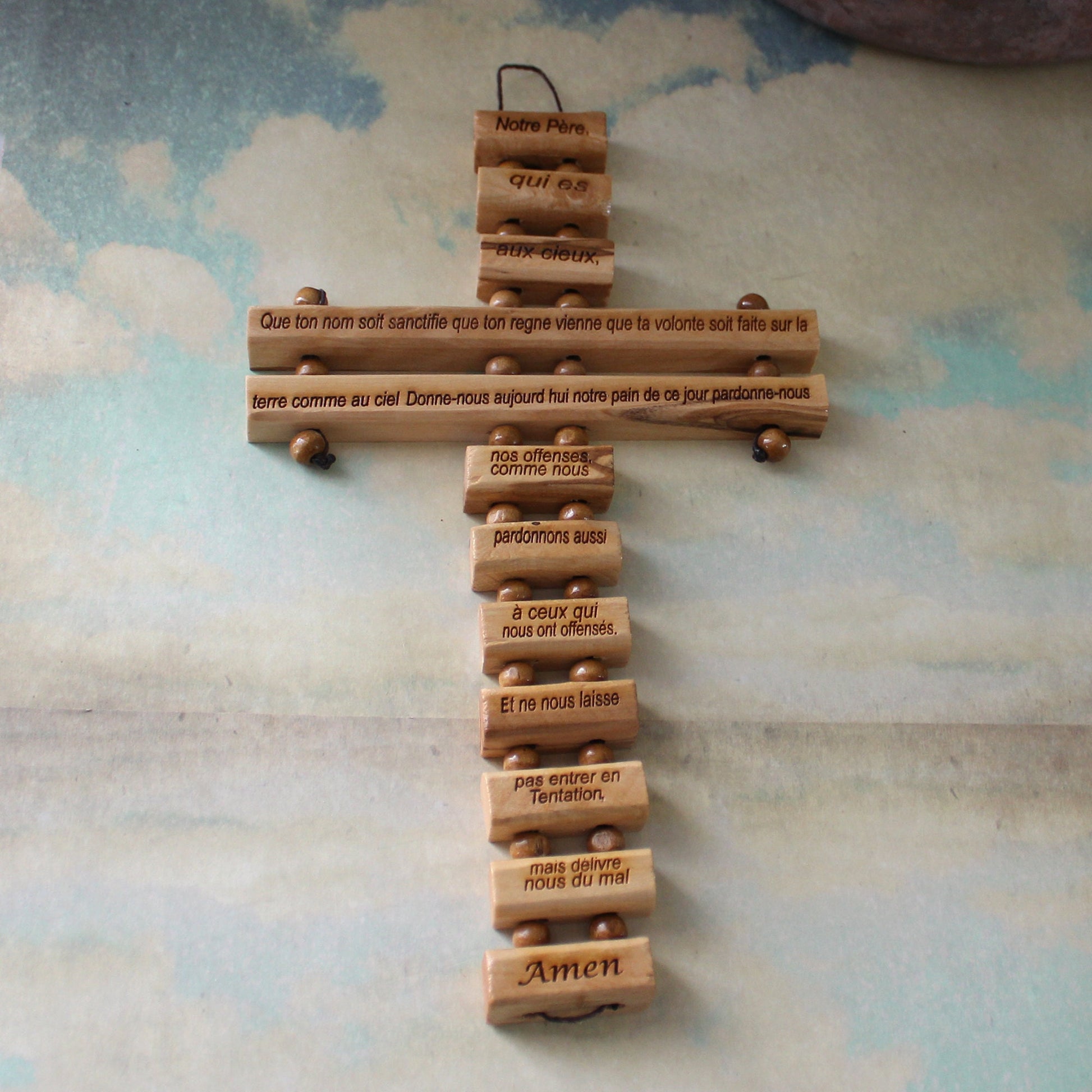 Handmade olive wood cross of “Our Father” in French, Notre Père Prayer made in the Holy Land Jerusalem. The material of the product is natural olive wood, which is very symbolic for all Christians. According to the Bible, it represents the sufferings of Jesus Christ.