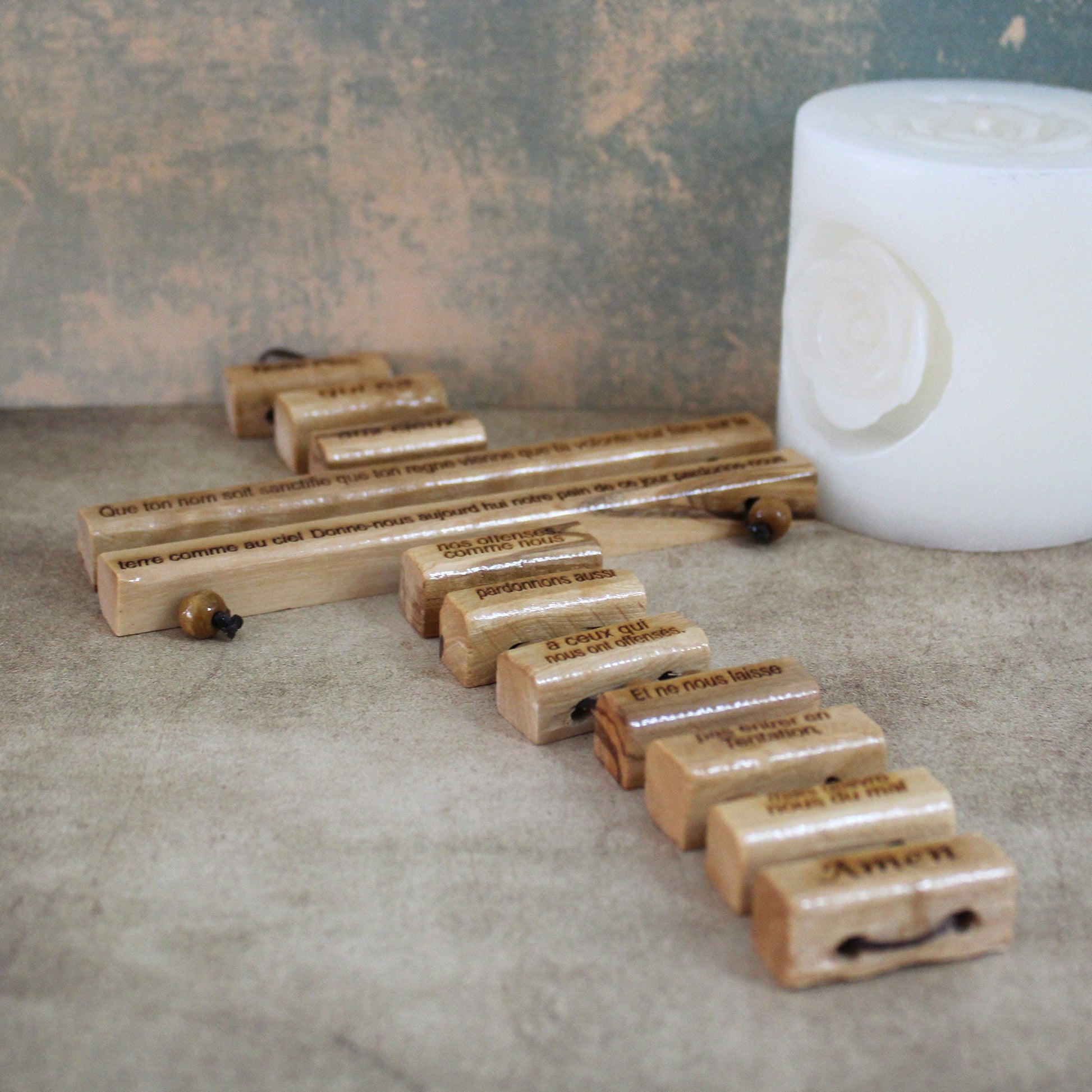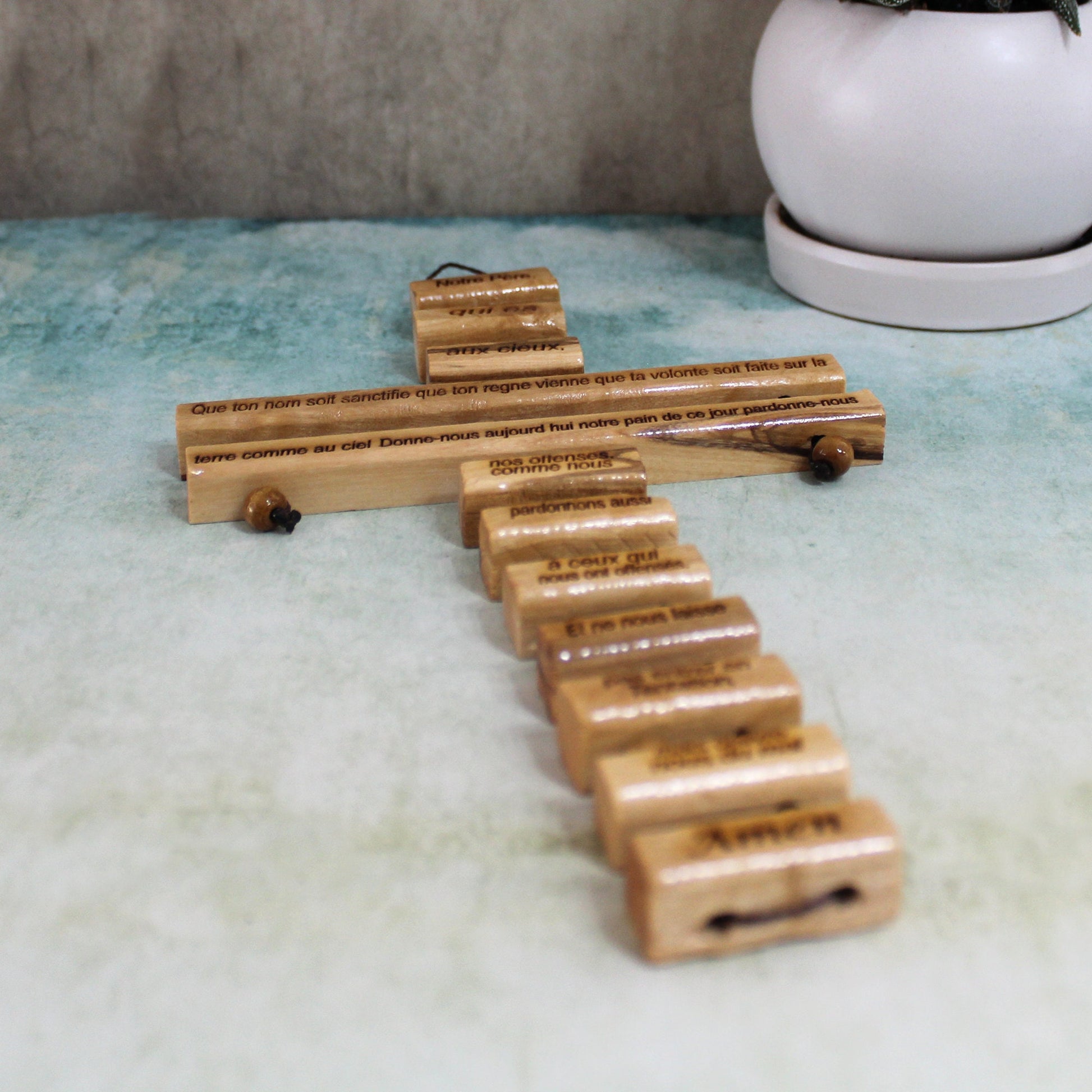 Our Father Prayer in French Engraved, Handmade Olive Wood Cross Wall Hanging, Wooden Blessing Cross for Wedding and Anniversary Gift