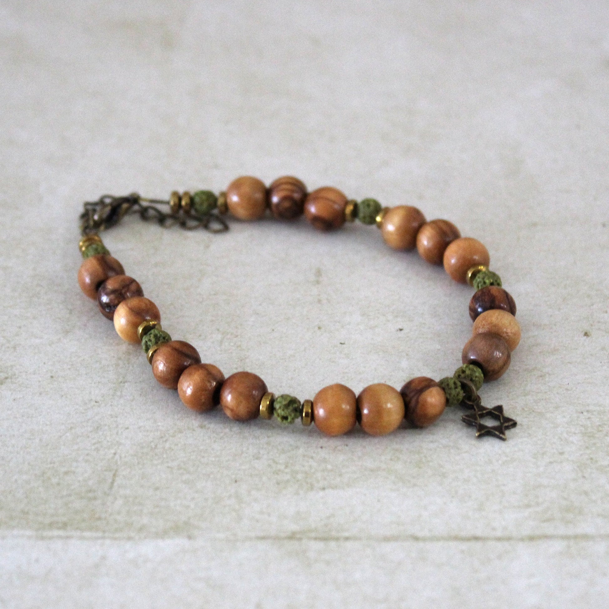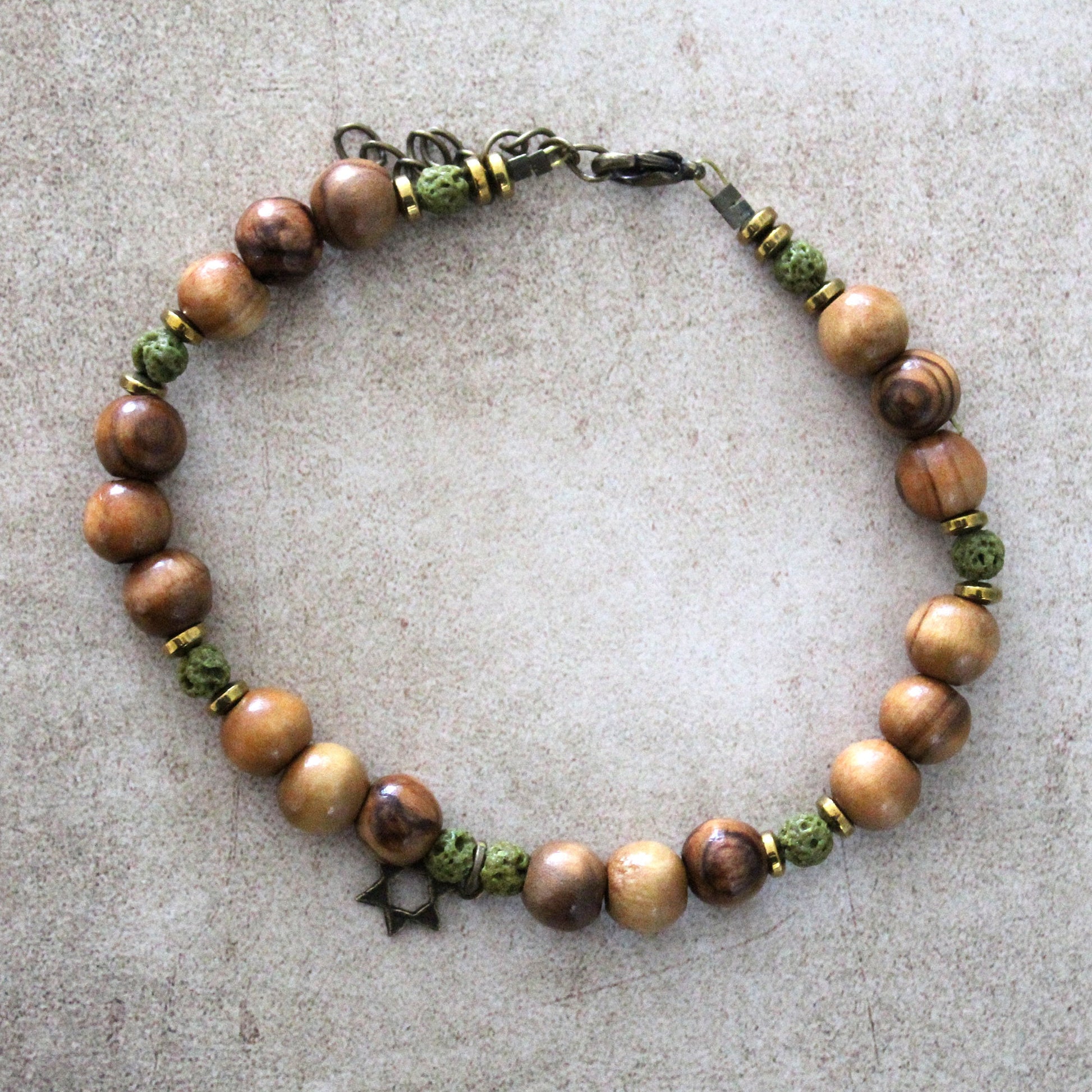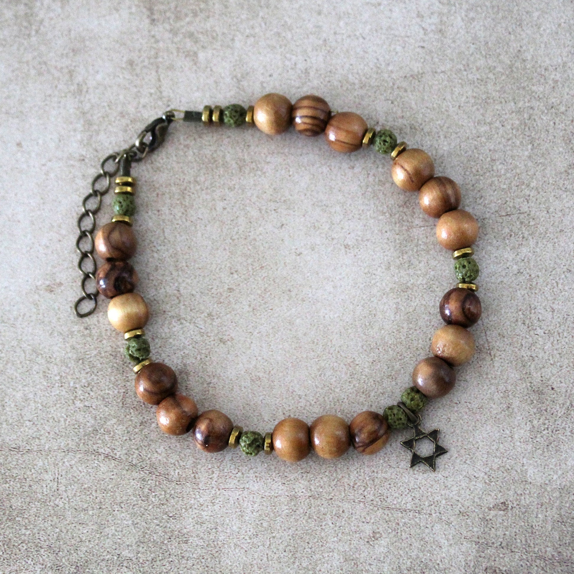 Elevate your style with the enchanting combination of olive-hued volcanic lava stone beads, emitting a natural allure adorned with a delicate Star of David, offering a harmonious blend of spiritual and aesthetic elements in one captivating piece.