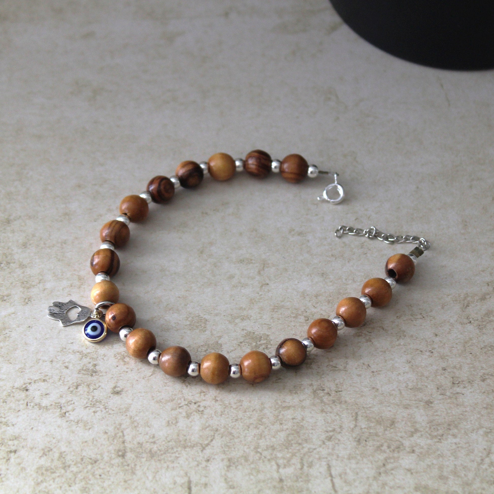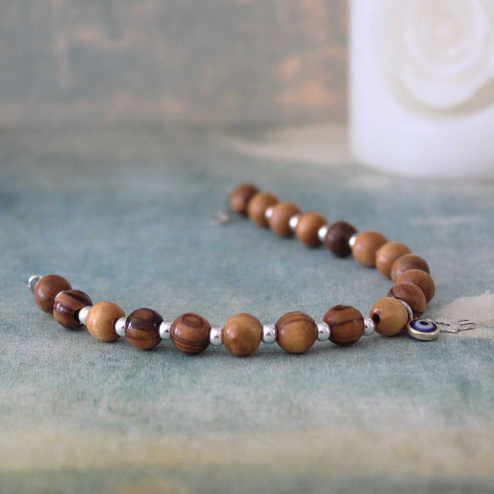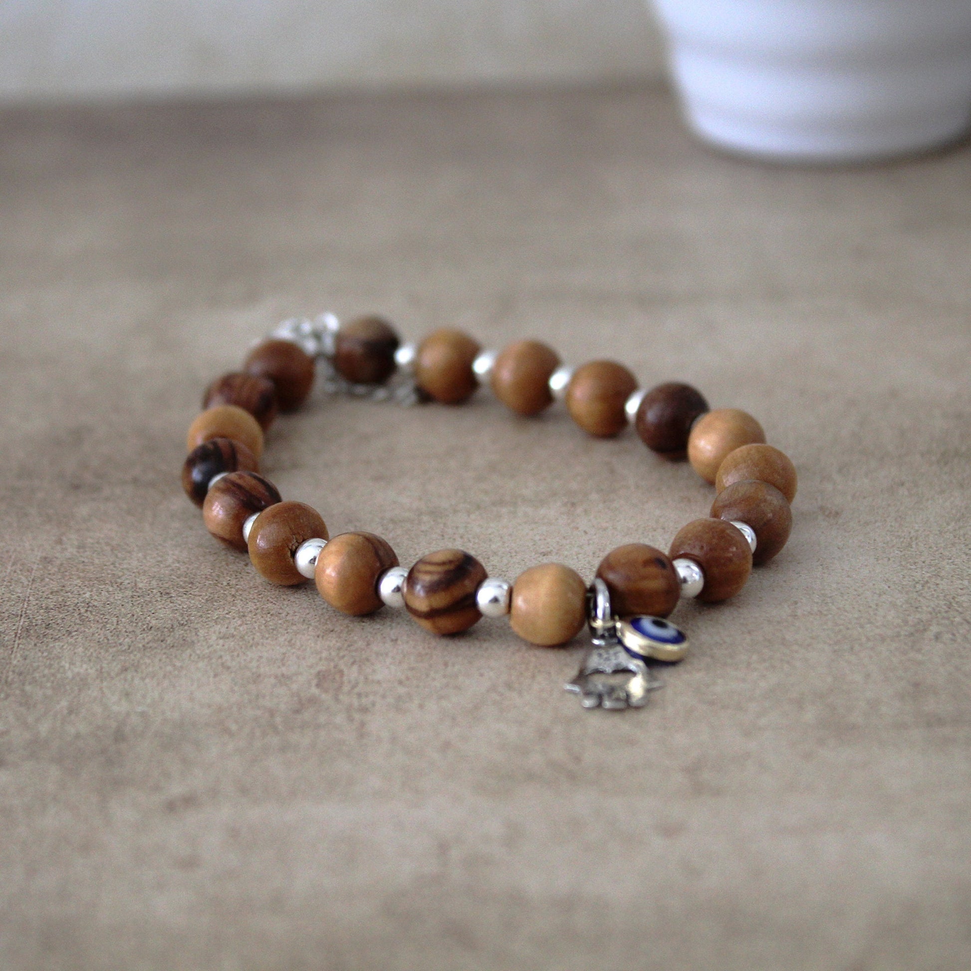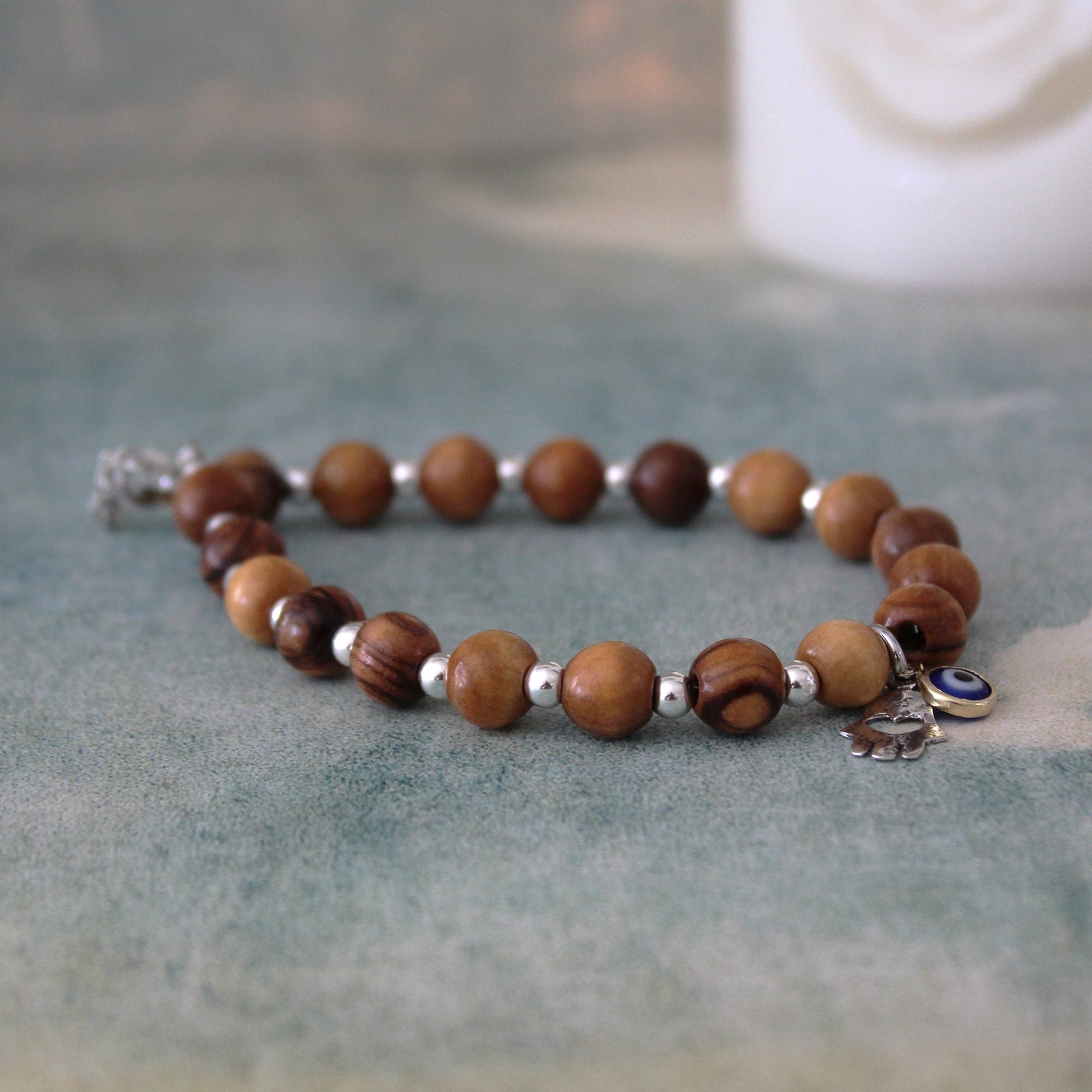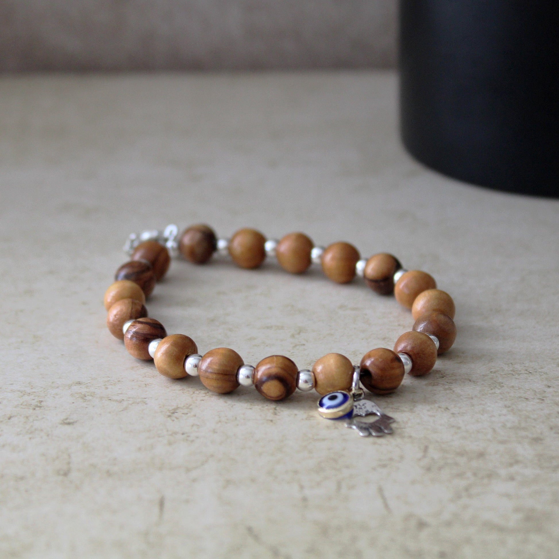 Embrace a touch of mystical protection with a dazzling fusion of olive wood beads, 925 silver beads, and captivating charms like the heart Hamsa and enchanting evil blue eye. Elevate your style while guarding against negativity with this exquisite blend of symbolism and beauty.