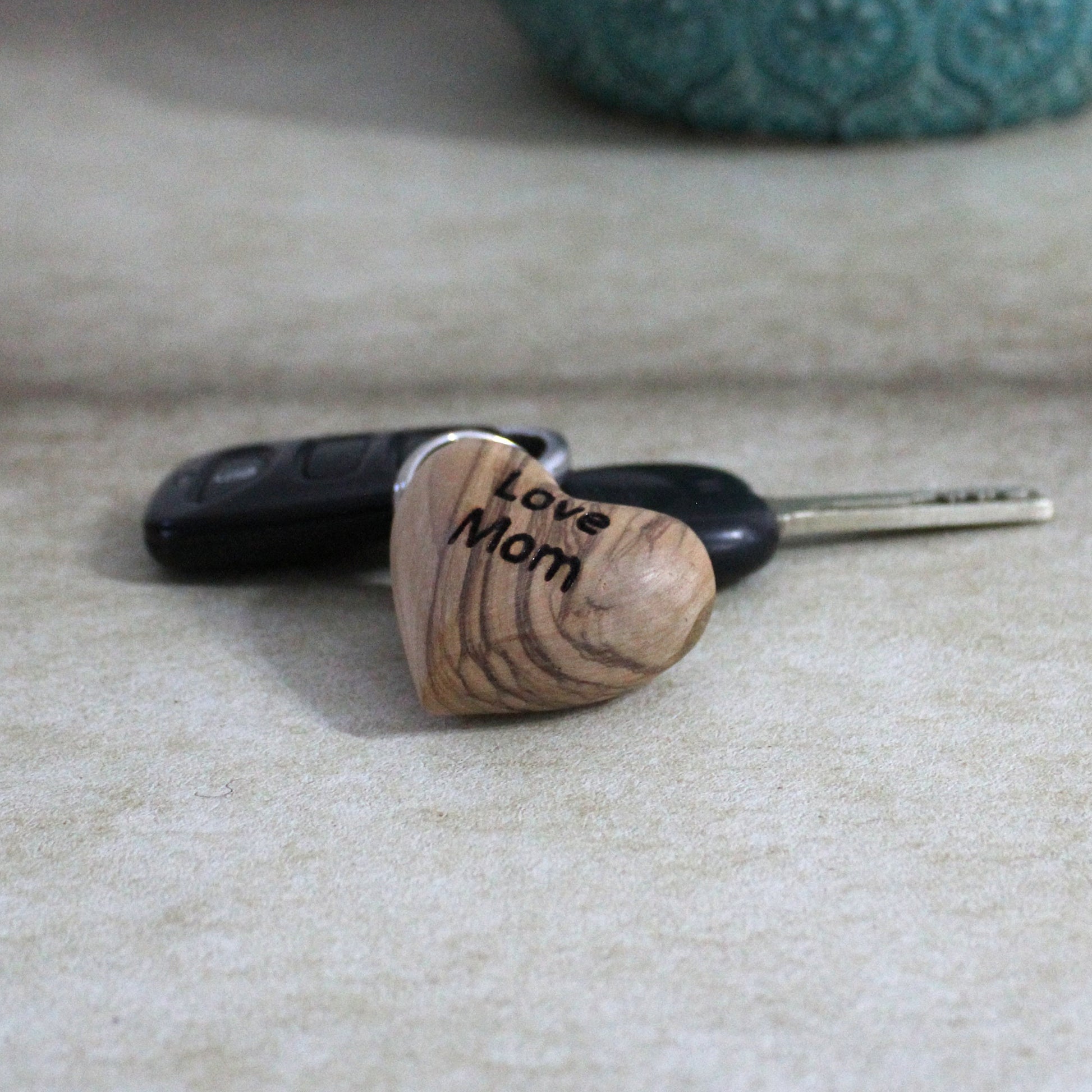 Personalize this olive wood heart by adding wording to each side. This stunning heart keyring works well as a gift for various occasions, including safe driving, new drivers, I love you, mom keychain, or just because. Add sentimental messages for your loved ones so they think of you while on the go.