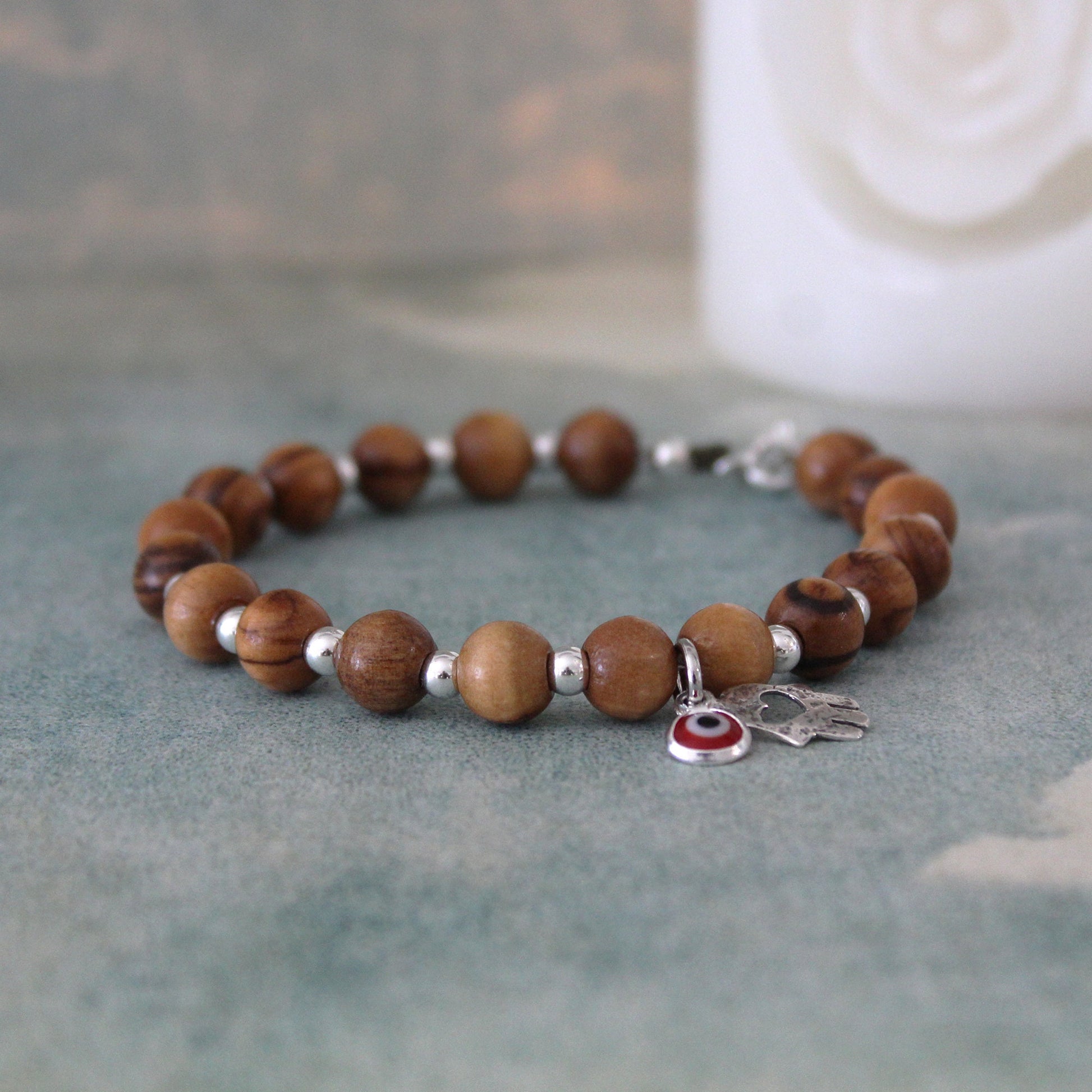Spiritual Harmony: Handcrafted Olive Wood Charm Bracelet for Energy, Protection & Meditation - Boho Hamsa Design with Red Evil Eye